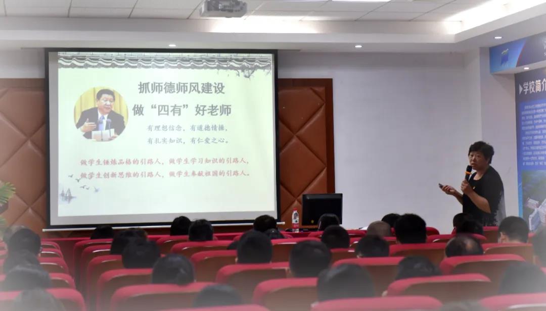杜冬丽书记从“教师、师德、师风解读”“教师职业道德的内容”“加强师德师风建设,增强使命感”三个方面,向在座的老师们全面解读了一个好老师应该具备的品质及如何做一位“四有”好教师。