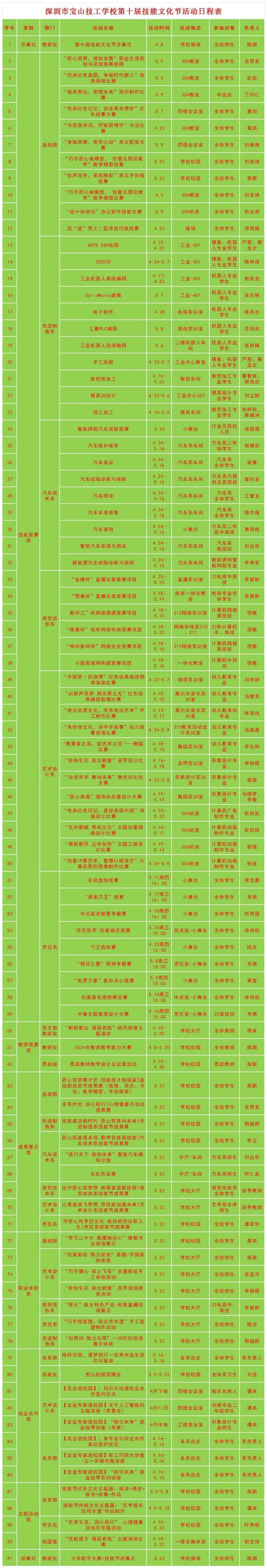 宝山技校第十届技能文化节已拉开“战幕”,本届技能节以“突出技能特色,打造精品项目,深化产教融合,提升品牌效应”为指导思想,对标示范性技工学校建设,校企合作,岗位实战,竞赛中引入企业,引入思政元素,全员参与,专业覆盖,开展形式多样的技能节竞赛和活动,有技能竞赛类、教师竞赛类、成果展示类、职业体验类、校企合作类以及主题活动类共六大类91个项目。下面一起来看看具体都有哪些活动吧~