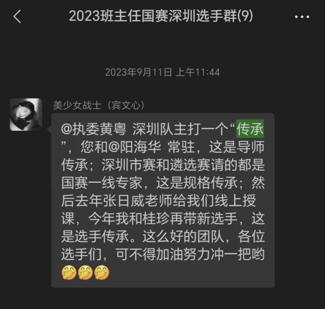 “还记得,在国赛遴选集训的时候,宾文心导师就说过,深圳队主打一个‘传承’,我希望将深圳市的这份温暖光亮传承给更多人,与更多教育工作者携手沐光而行”。