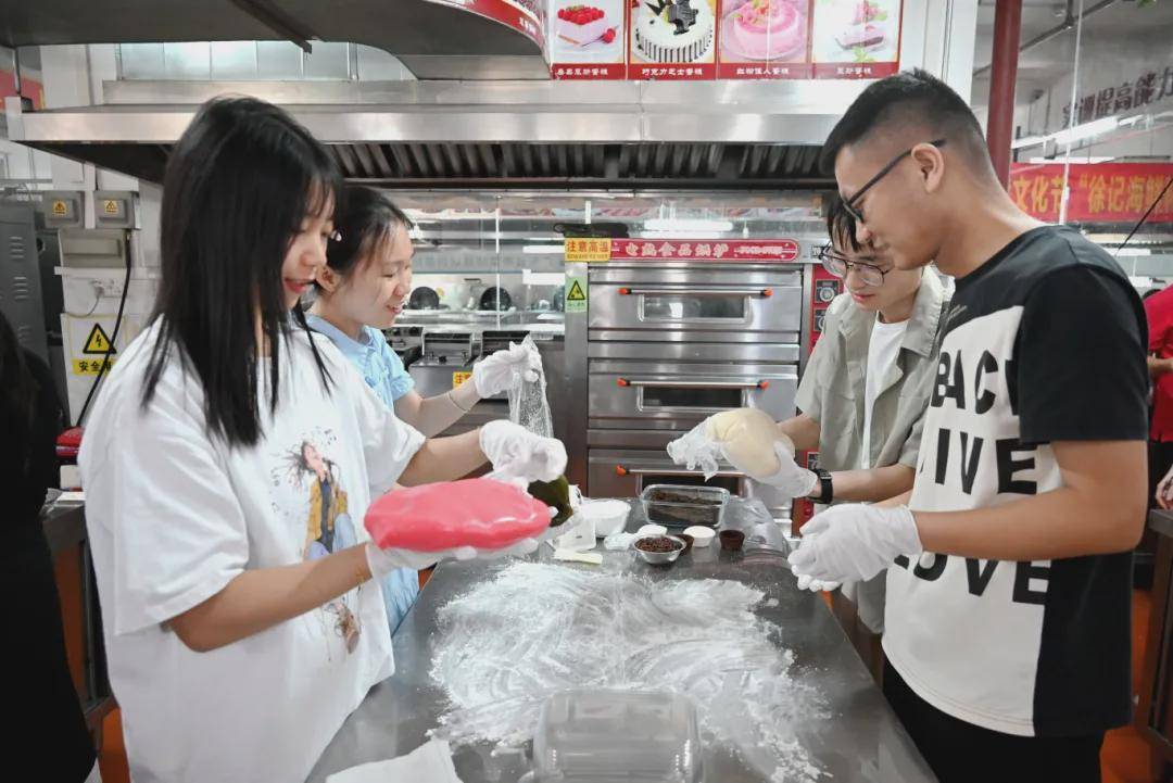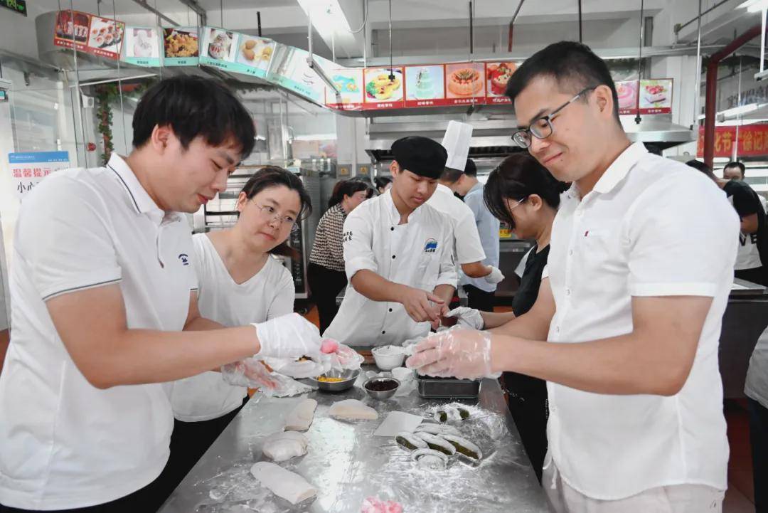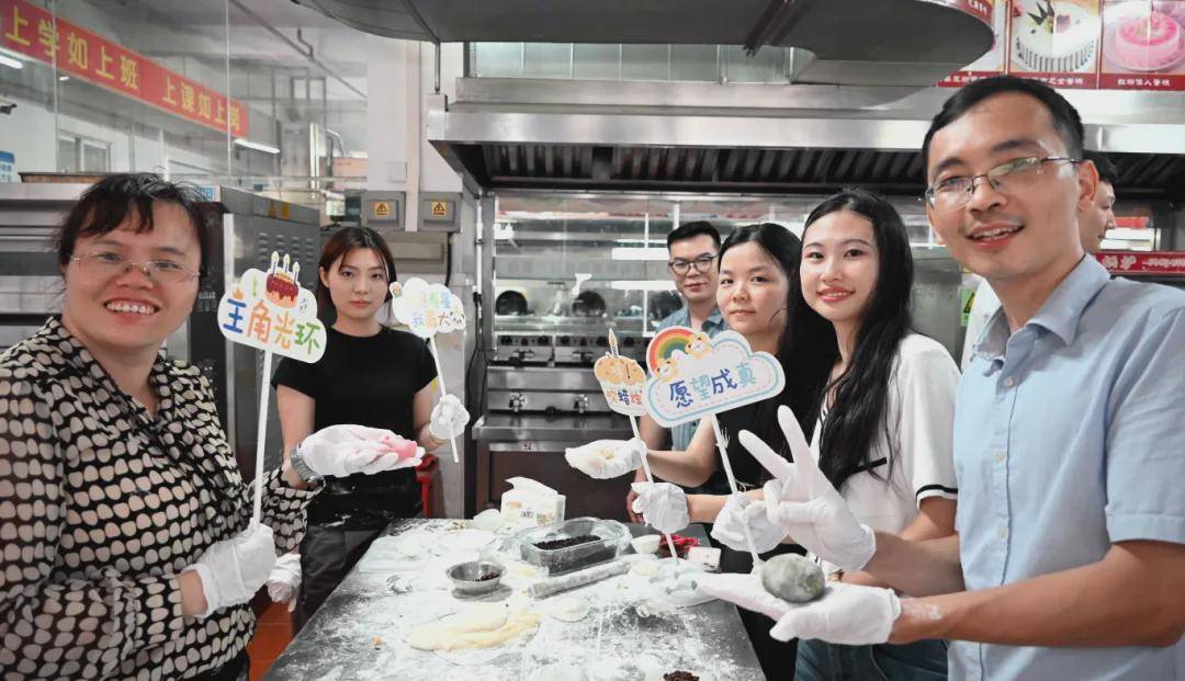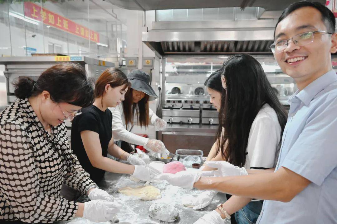 教职工们纷纷动起手来,将现打的奶油和水果、奥利奥饼干碎等,用擀好的糯米皮包裹住,用包包子的方法将它裹成圆形——“雪媚娘”就做好啦!整个过程中充满了欢声笑语。