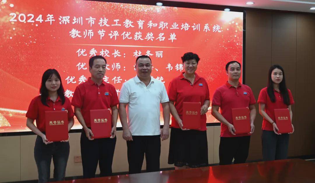 近日,2024年深圳市技工教育和职业培训系统教师节评优活动圆满落幕,我校杜冬丽副校长荣获“优秀校长”称号,沈梅、韦锦老师获评“优秀教师”称号,林育纯老师获评“优秀班主任”称号,学生处王涛副处长获评“先进教育工作者”称号,学校黄立新理事长为他们颁发荣誉证书。