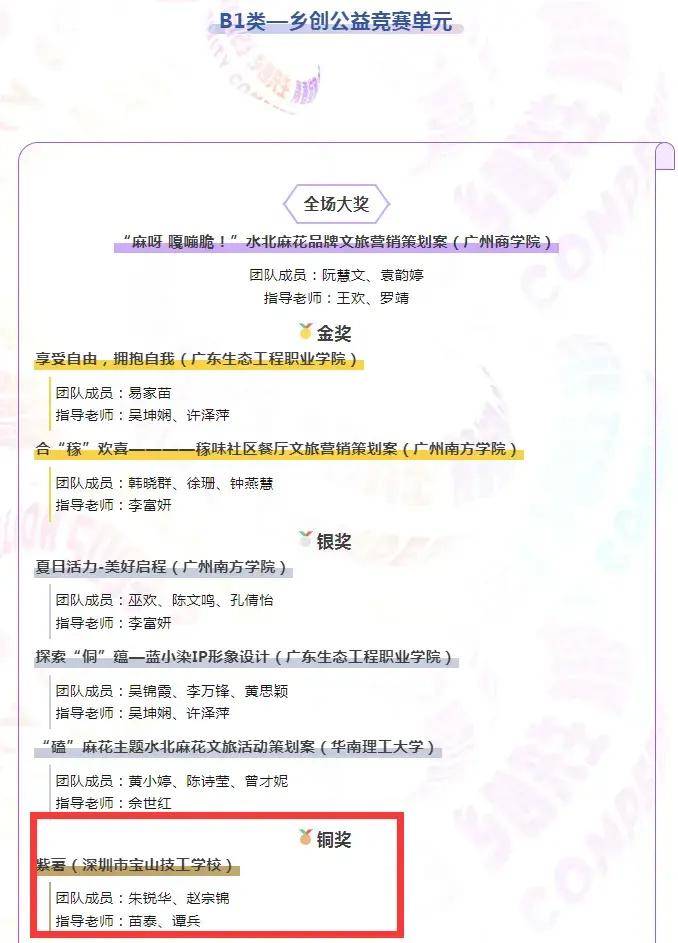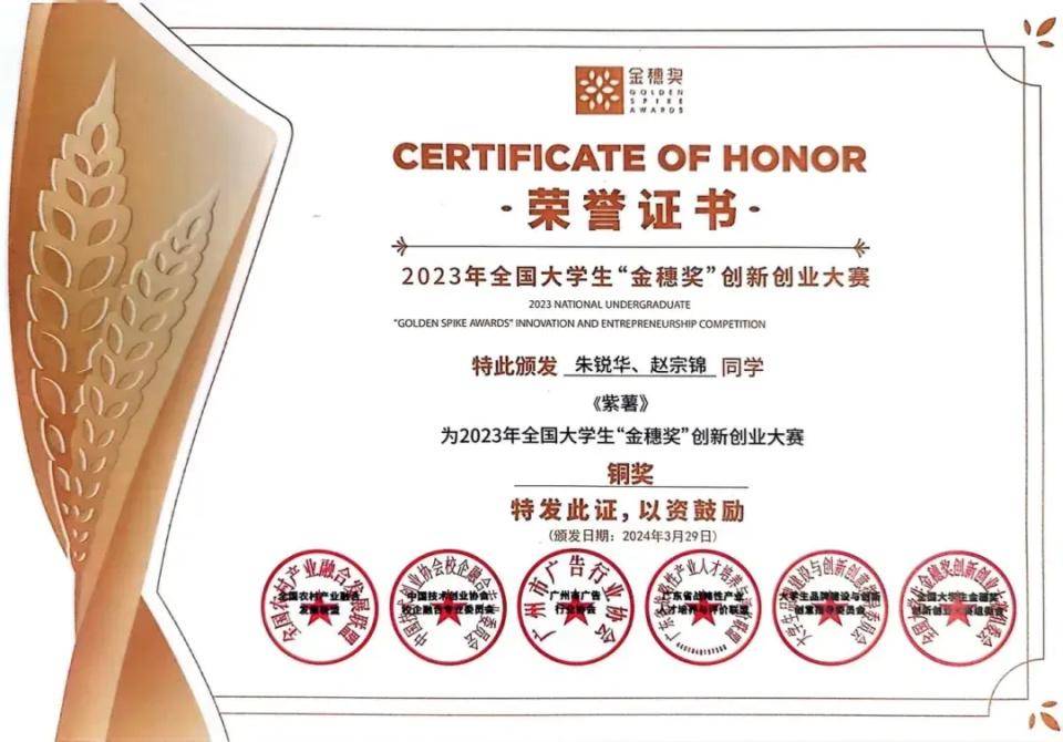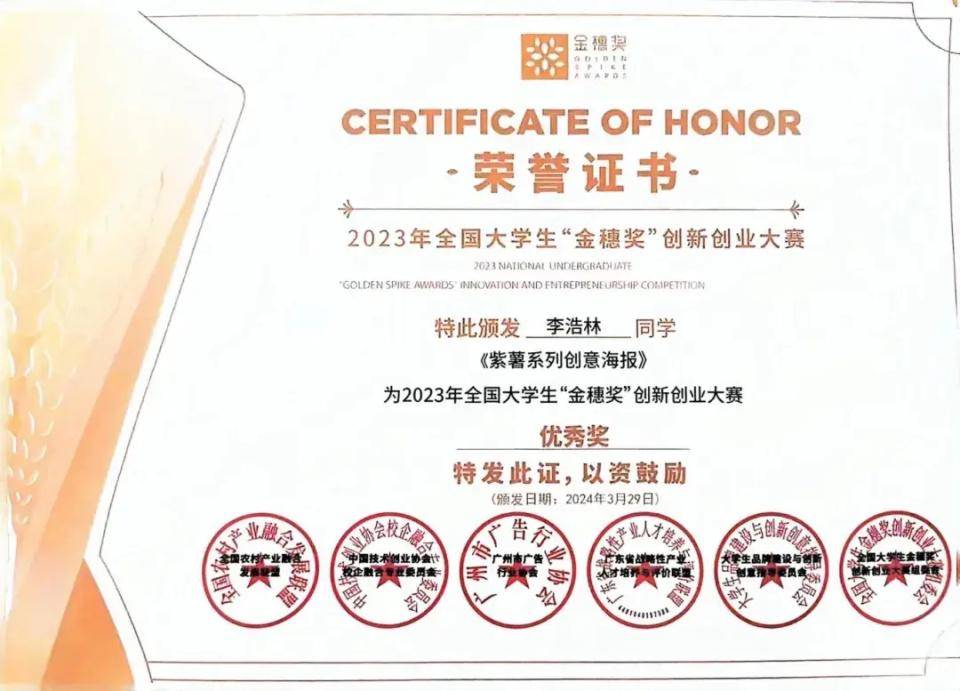 3月29日,2023全国大学生金穗奖创新创业大赛论坛暨2023赛事(乡创共生 青春绽放)颁奖典礼在广州市禺见艺创中心举行。我校朱锐华、赵宗锦同学团队的参赛作品《紫薯》获得B1类乡创公益竞赛单元铜奖,李浩林同学的参赛作品《紫薯系列创意海报》获得优秀奖;深圳市宝山技工学校获得“最佳组织院校”荣誉称号。