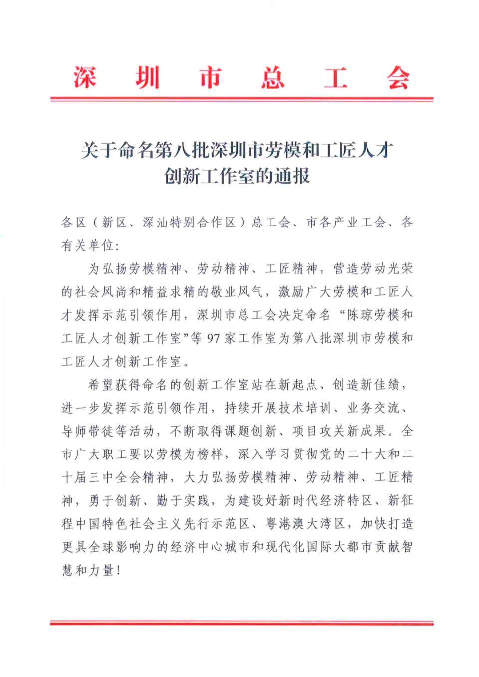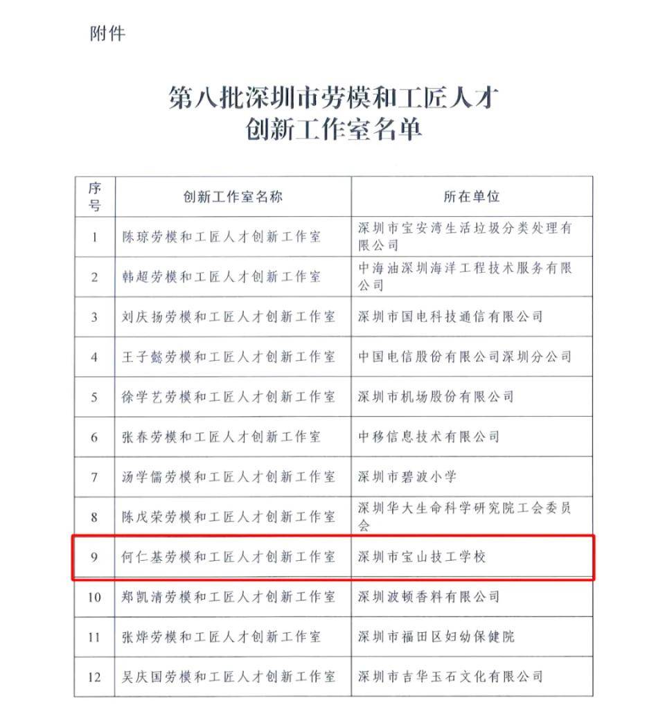 10月18日,深圳总工会发布了《关于命名第八批深圳市劳模和工匠人才创新工作室的通报》,选树97个工作室为第八批深圳市劳模和工匠人才创新工作室。其中,宝山技工学校“何仁基劳模和工匠人才创新工作室”,凭借其显著的创新成果和突出的引领作用成功入选。
