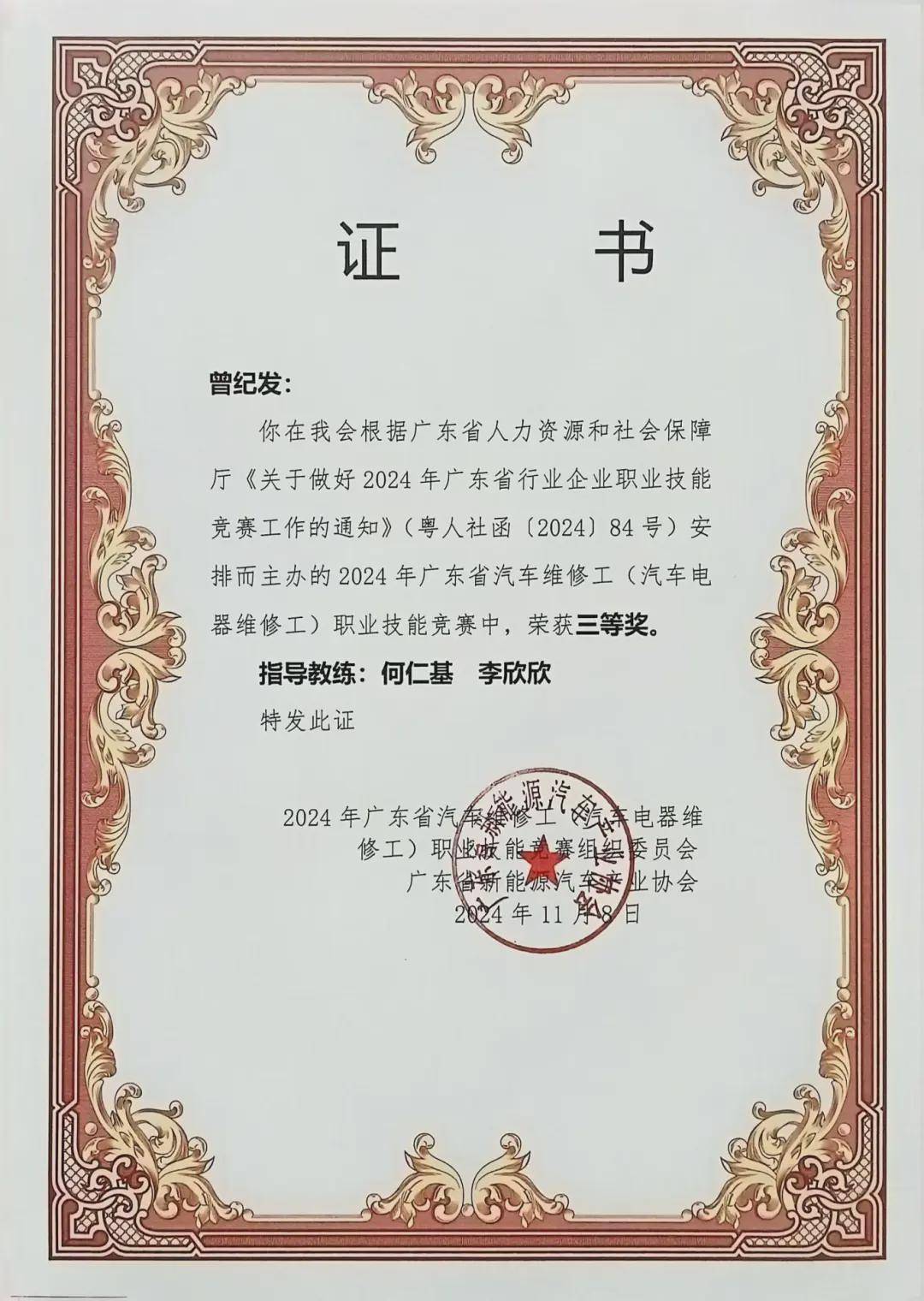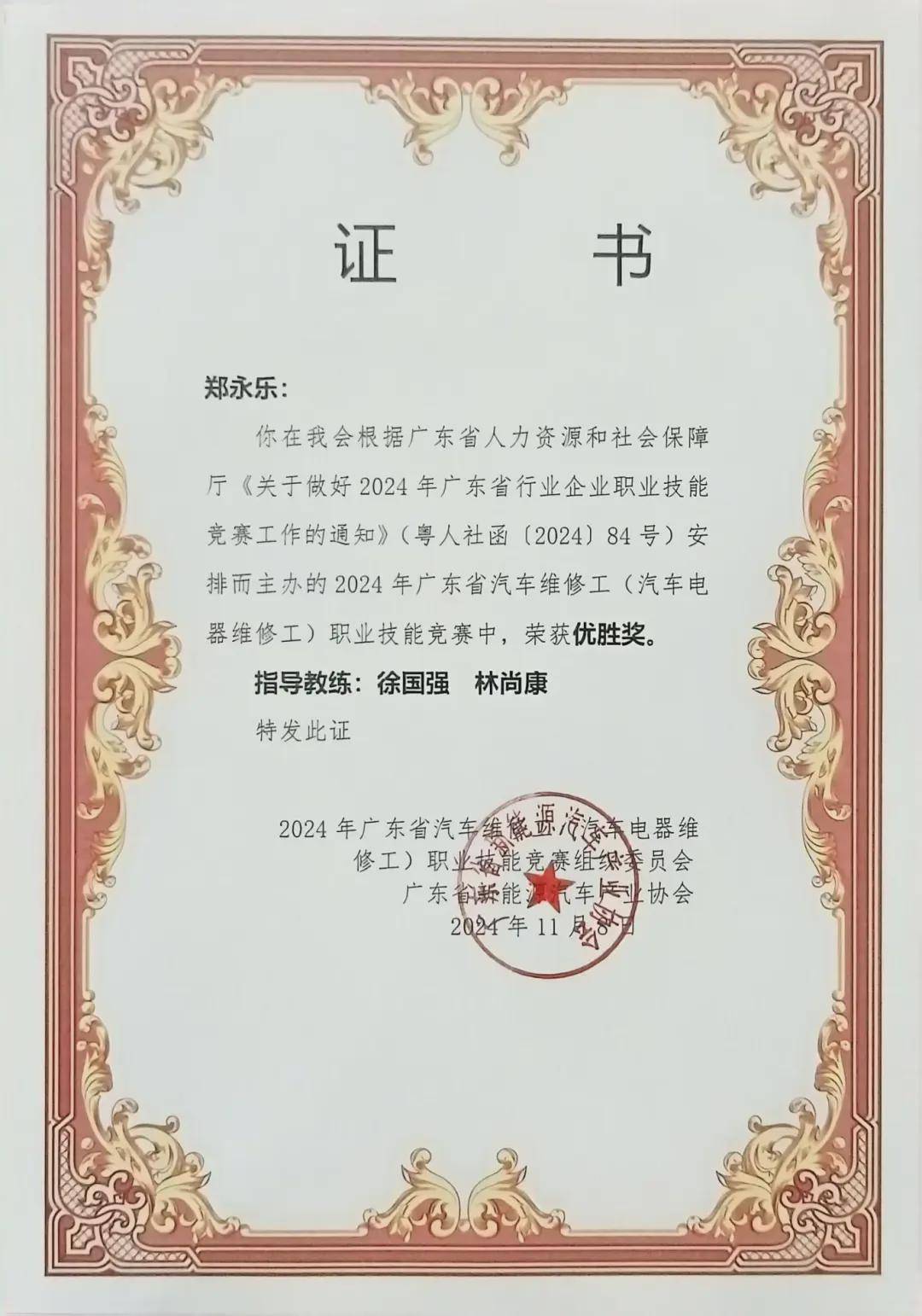 近日,2024年广东省汽车维修工(汽车电器维修工)职业技能竞赛圆满落幕。我校汽车技术系教师凭借着扎实的专业技能与出色表现,取得优异成绩,其中,汽车技术系教师曾纪发获得本次大赛三等奖、教师郑永乐获得本次大赛优胜奖。