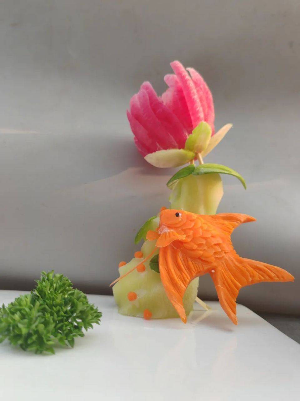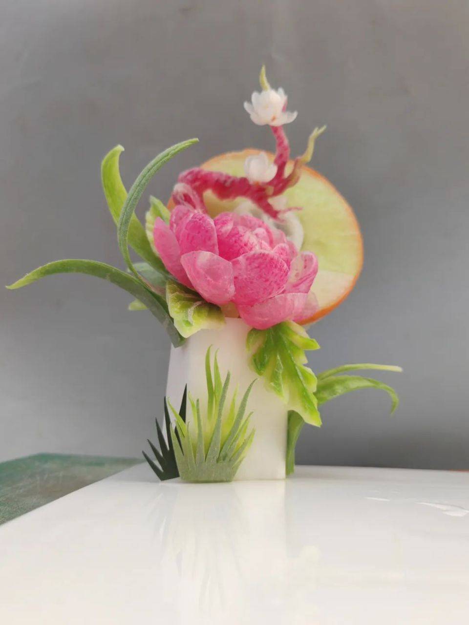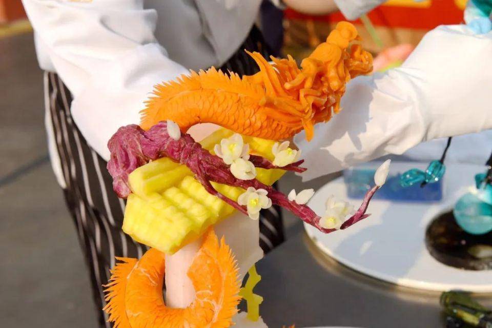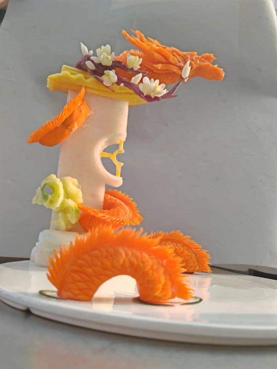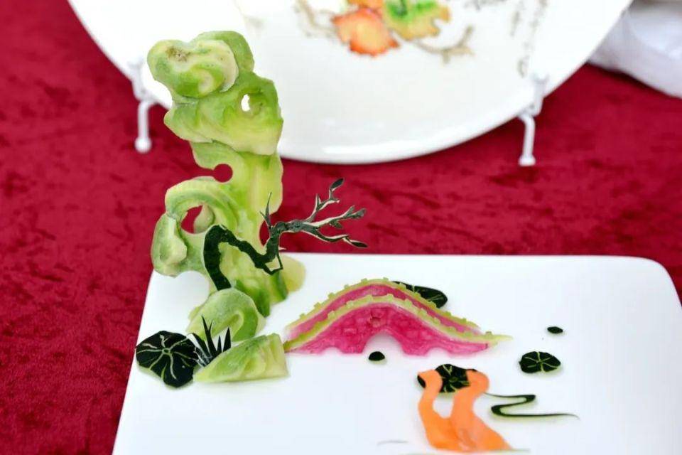 此次盘饰比赛采用现场制作、成品展示两种形式展现,分为立体盘饰、平面盘饰。按照评比规则,从雕刻绘画、色彩搭配、立意选材、食品卫生、整体效果、仪容仪表等7个方面进行现场比拼。