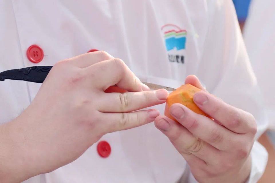 每位参赛选手“各显神通”,用尽自己的浑身解数,灵动的巧手上下翻腾,削、切、割、剐、雕,无所不用。只见参赛选手们一个个落刀有分寸,起刀准确,刀落刀起,轻重缓急,丝毫不乱,将各类蔬菜切成了丝、条、片、块等形状,进行摆盘组合。最终每位选手在规定时间内全部完成。