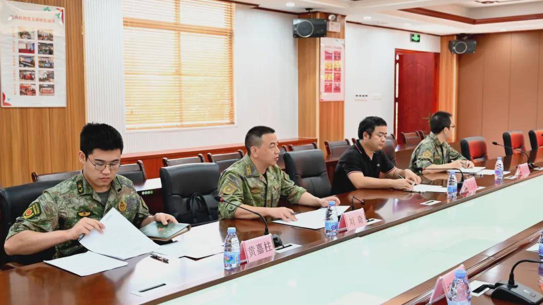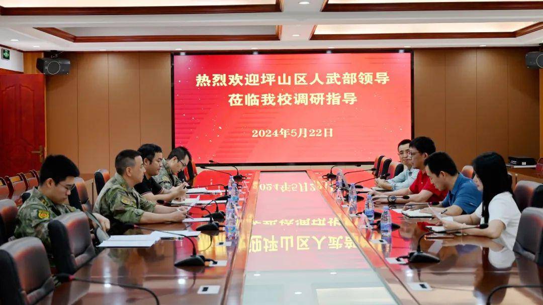 近日,坪山区人武部副部长刘奇、军事科参谋刘文杰、黄嘉柱,坪山街道武装部副部长毛志敏一行来我校调研指导征兵工作,我校党支部书记张晋平、校办、学生处负责人参加座谈。