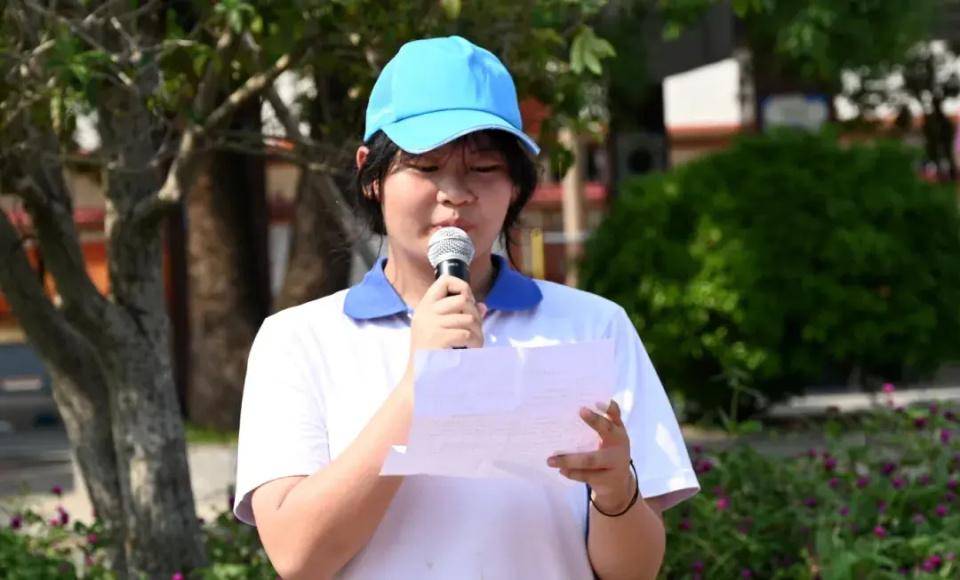来自24形象设计1班的包芯瑜同学代表发言。她向同学们分享了军训中的点滴感受与收获,表达了对教官、老师及学校的感激之情。她号召全体新生将军训中习得的习惯、技能、意志和纪律投身于未来的学习之中,不断成长进步,做新时代新青年。