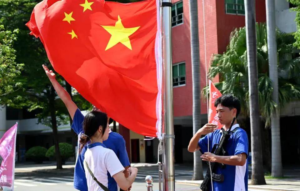 迎国旗,奏国歌,升国旗,全体师生行注目礼。