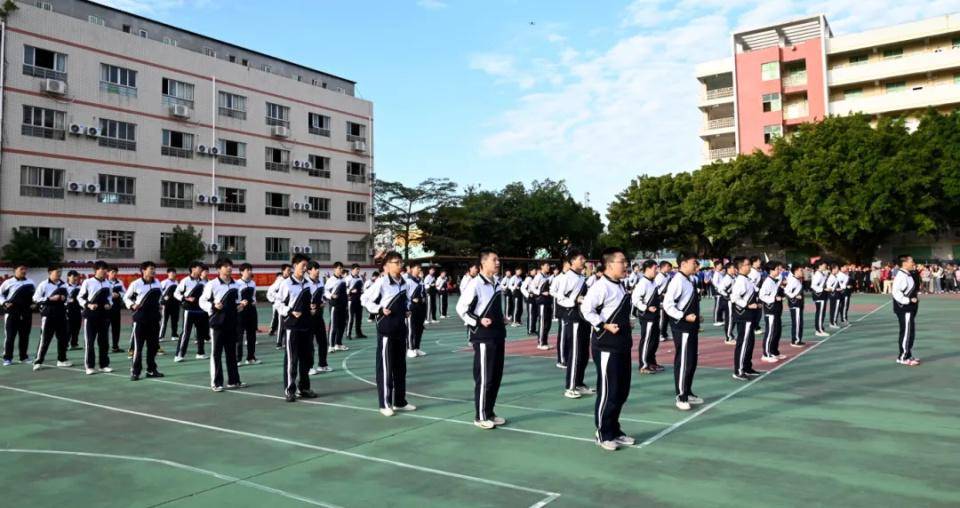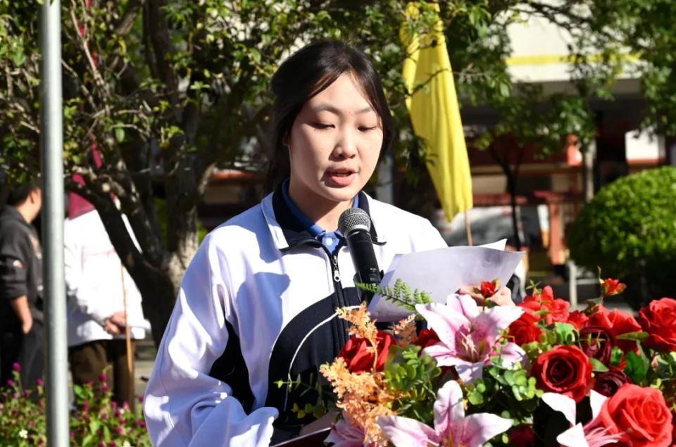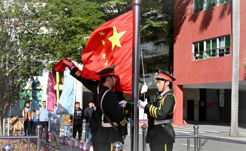 英姿飒爽的国旗护卫队迈着整齐划一、铿锵有力的步伐,护送五星红旗走向升旗台。庄严的国歌声响起,全体师生肃立致敬,面向国旗行注目礼。