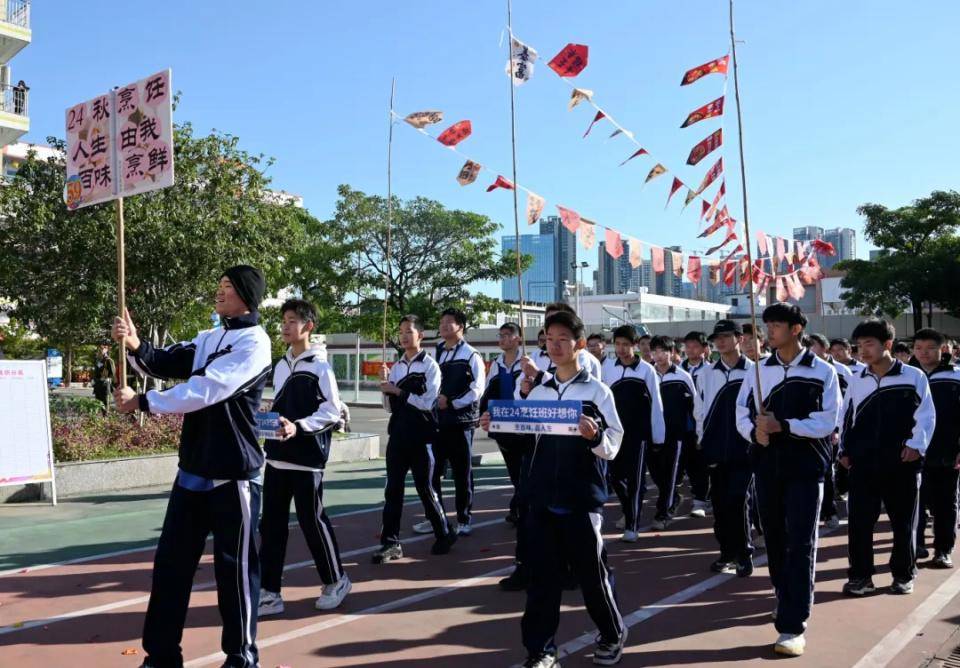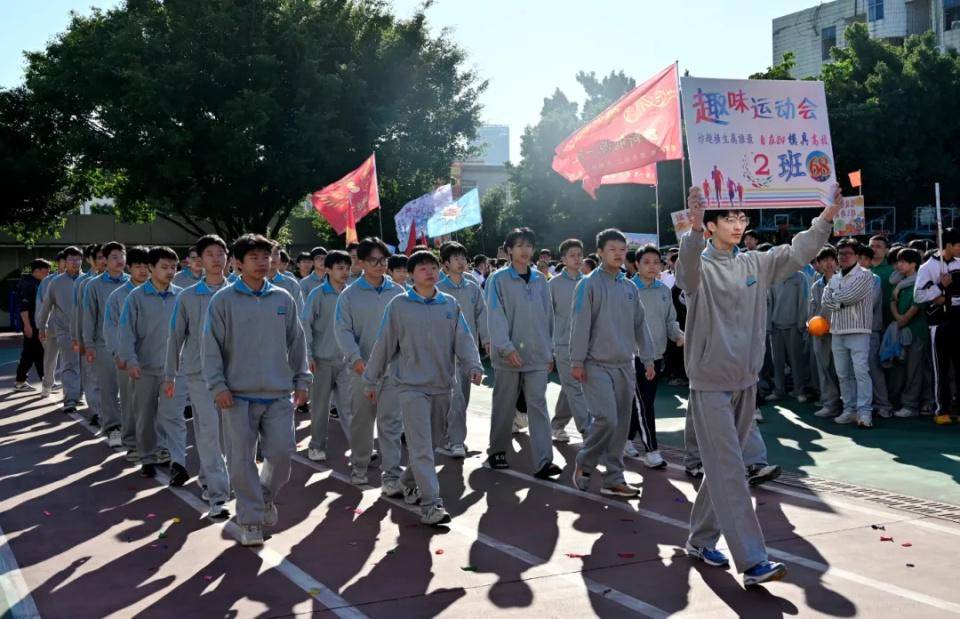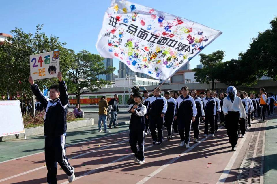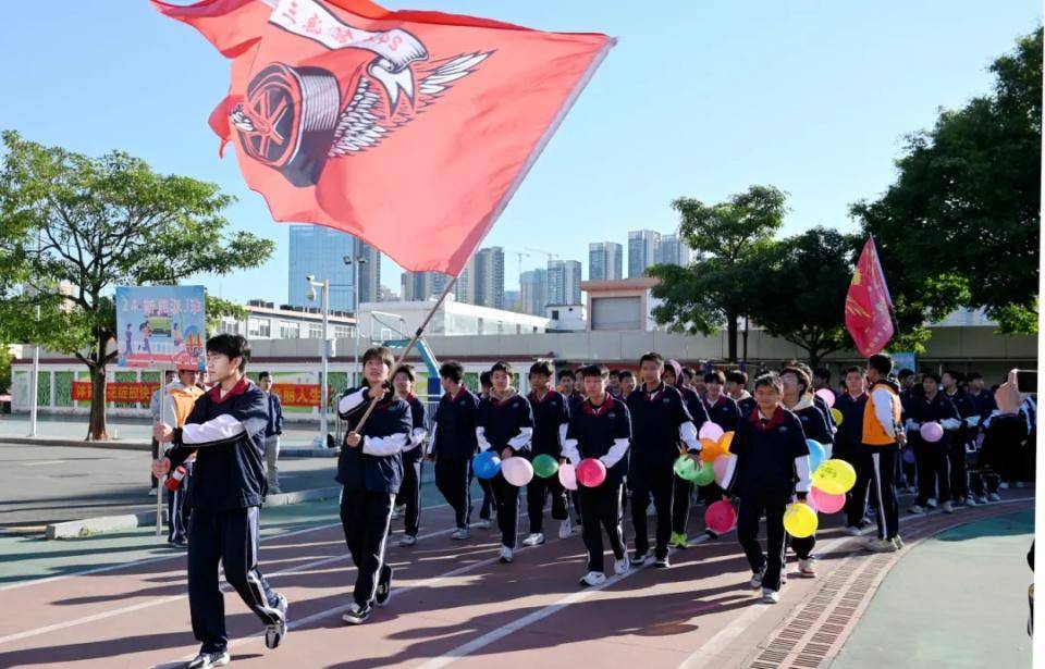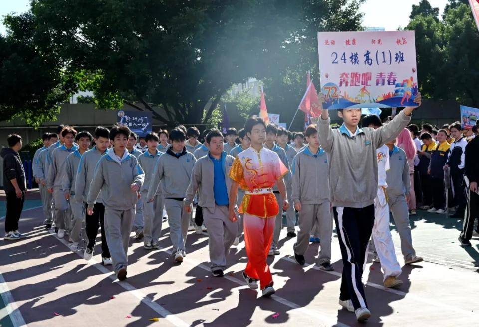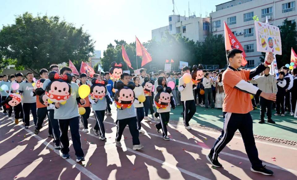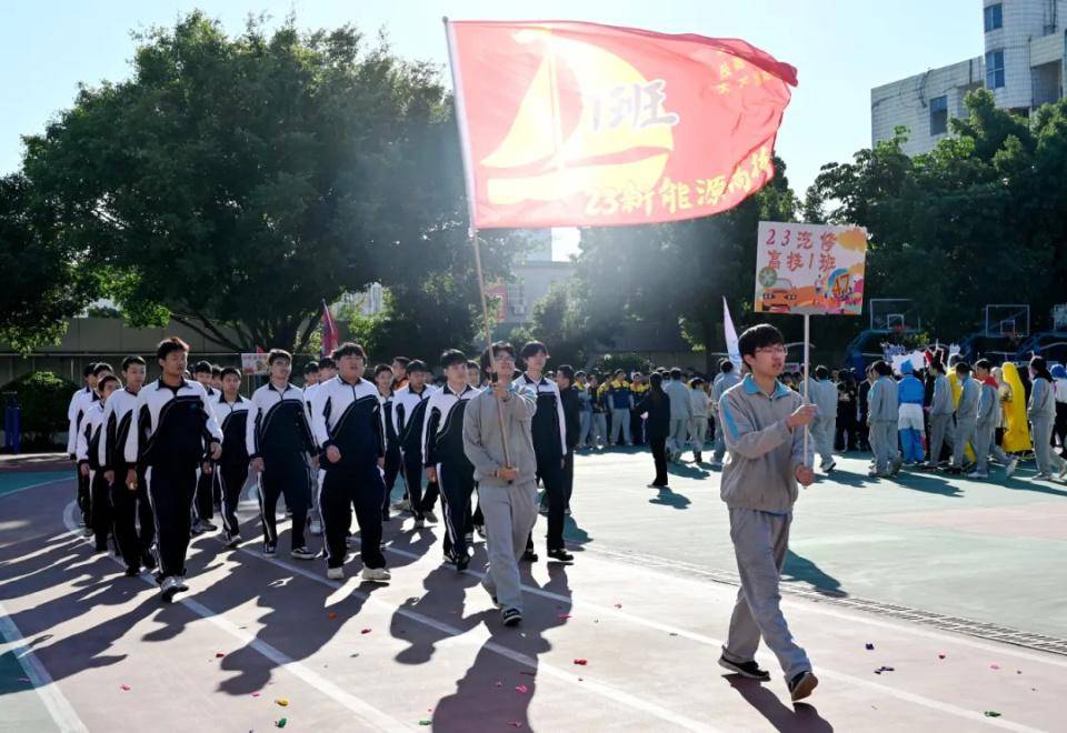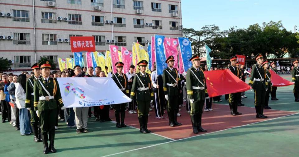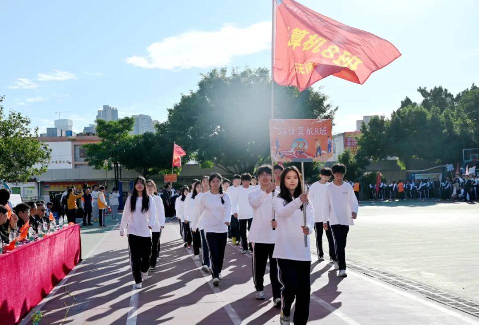伴随着欢快激昂的音乐,国旗队、校旗队、会旗队、彩旗队、裁判员代表队、教职工代表队以及各班方队相继入场,各班级方队依次经过主席台并进行精彩的表演。